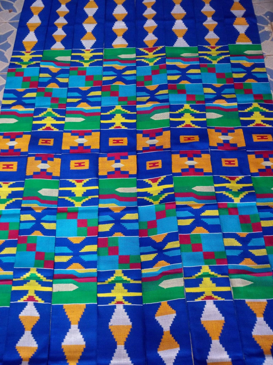 Kente is woven on a horizontal strip loom, which produces a narrow band of cloth about four inches wide. Several of these strips are carefully arranged and hand-sewn together to create a cloth of the desired size. Most kente weavers are men.