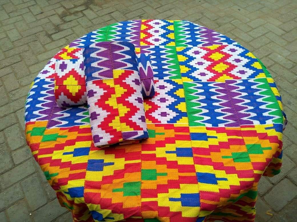 Weaving involves the crossing of a row of parallel threads called the warp (threads running vertically) with another row called the weft (threads running horizontally). A horizontal loom, constructed with wood, consists of a set of two, four or six heddles (loops for holding thread), which are used for separating and guiding the warp threads. These are attached to treadles (foot pedals) with pulleys that have spools of thread inserted in them. The pulleys can be used to move the warp threads apart. As the weaver divides the warp threads, he uses a shuttle (a small wooden device carrying a bobbin, or small spool of thread) to insert the weft threads between them. These various parts of the loom, like the motifs in the cloth, all have symbolic significance and are accorded a great deal of respect.